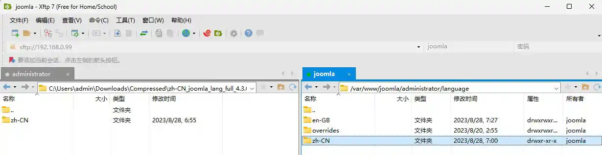 从Joomla官网下载tar.gz安装包,并上传至网站根目录,也可以直接在服务器上wget直接下载,当然也可以下载.zip包,只是需要在Debian上安装unzip或者解压后再上传,会有些麻烦,我个人比较习惯用Xshell,用Xftp上传文件也比较方便,所以选择下载后再上传。
